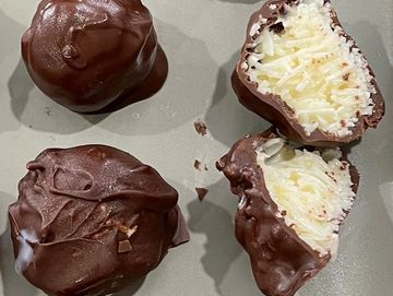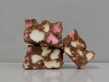 Marshmellow pieces with coconut in a milk or white chocolate slab.