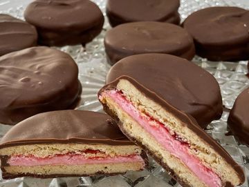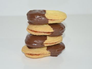 Two biscuits with a jam and marshmellow filling, coated in milk chocolate.