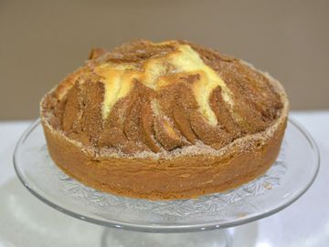 Apple teacake, topped with cinnamon sugar and apple pieces.